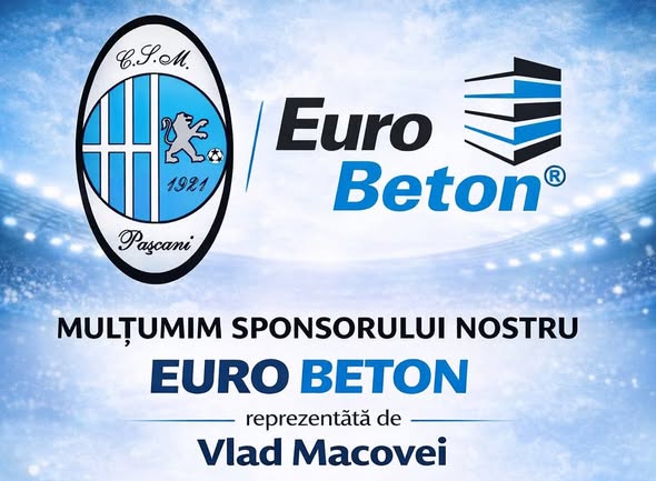 Clubul Sportiv Municipal Pașcani adresează sincere mulțumiri firmei Euro Beton reprezentată de Vlad Macovei, pentru sprijinul oferit sportului pășcănean. Prin implicarea și susținerea sa, EURO BETON...